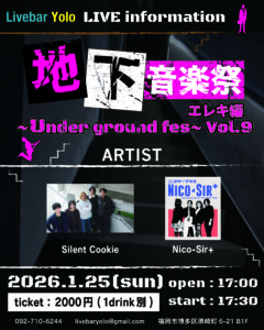1052026地下音楽祭 エレキ篇 ~Under ground fes~ Vol.9イベント詳細日付: 2026年1月25日 17:30 – 21:00地下音楽祭 エレキ篇 ~Under ground fes~ Vol.9 2000円+1ドリンクOPEN /17:00 START /17:30ARTIST / Silent Cookie Nico-Sir+@Livebar YOLOぜひお越しください! 弾き語り投げ銭ライブ前の記事